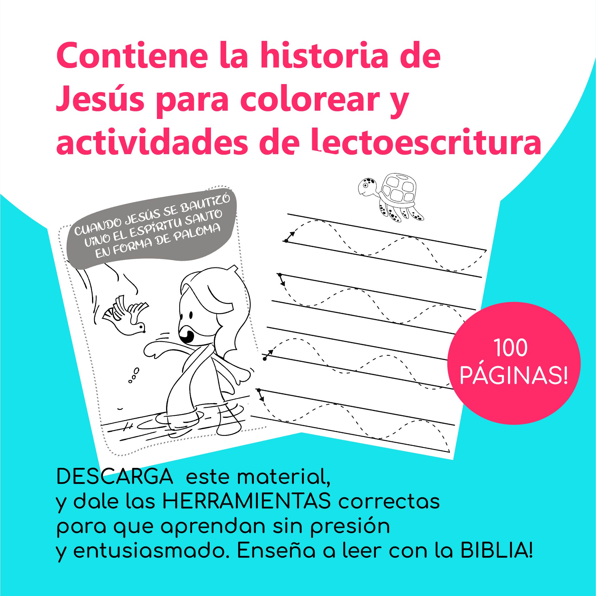 • La historia de Jesús narrada y presentada para que el niño pueda reconocer momentos claves de su ministerio y diseñada para colorear.