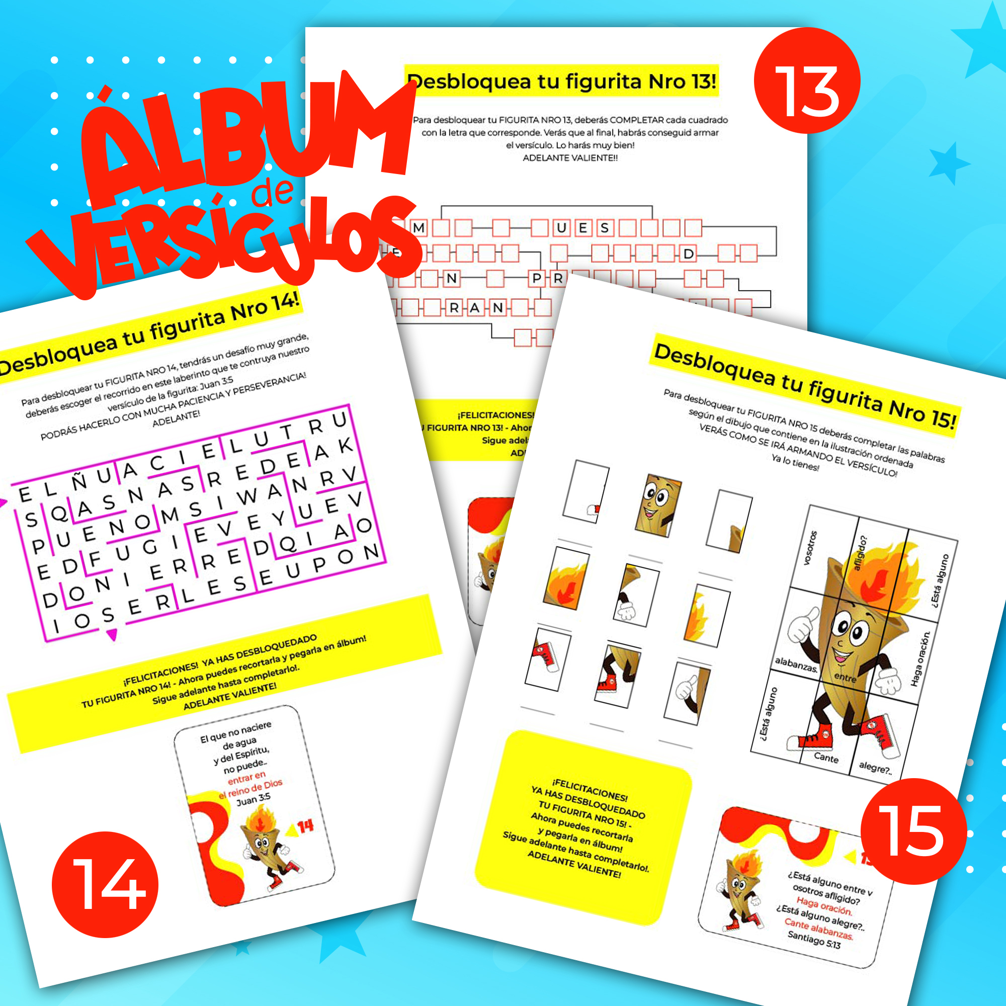 - Álbum de versículos Bíblicos. Encontrarás un colorido listo para imprimir ( versión color o BN para que los niños coloreen) Para completar el álbum, el niño deberá desbloquear cada figurita que contiene uno de los 84 versículos con actividades interactivas ( una por versículo) para que el niño/preadolescente memorice, comprenda y continúe en el proceso aprendizaje. / Carolina Biancardi